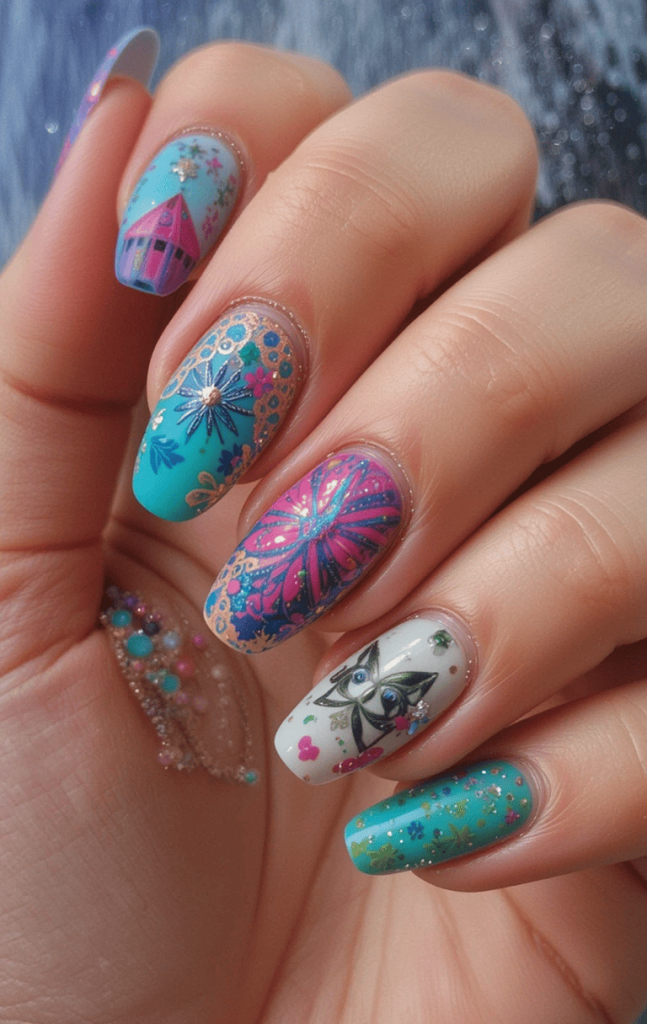 Intricate tribal and mandala-inspired nails are perfect for a bohemian festival aesthetic.