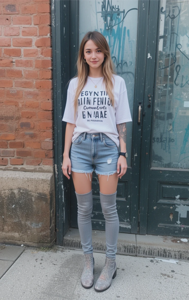 • Outfit: Oversized hoodie paired with biker shorts or loose jeans.