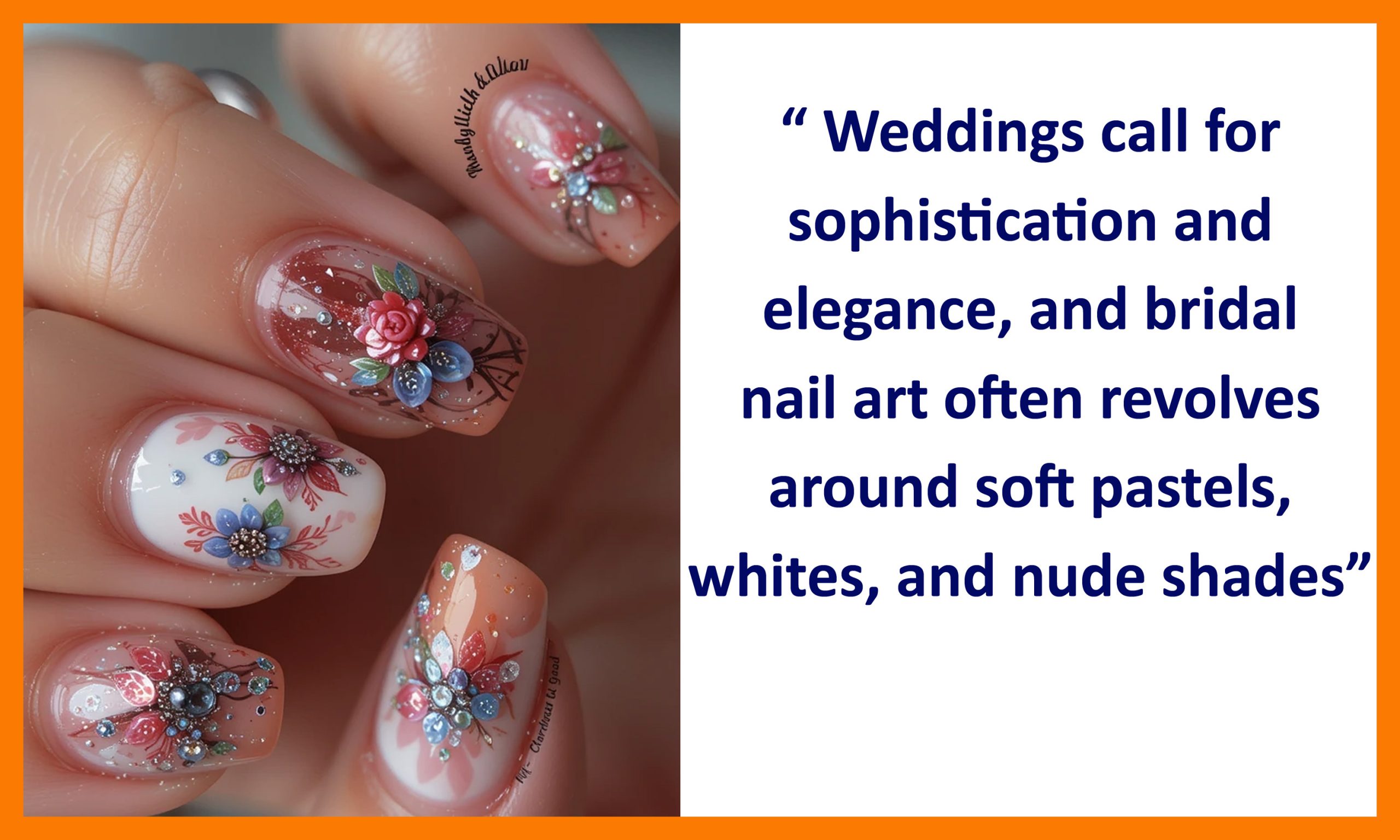 - Custom Nail Art: Personal touches like initials, wedding dates, or miniature designs matching the wedding dress.